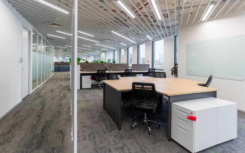 Không gian mở loại bỏ vách ngăn cứng nhắc, tạo cảm giác thông thoáng hơn. Thiết kế này thúc đẩy giao tiếp hiệu quả, khuyến khích sự tương tác của mọi người. Bàn ghế có thể dễ dàng di chuyển theo nhu cầu. Nhân viên tự do chọn chỗ ngồi phù hợp nhất. Sự linh hoạt hỗ trợ thay đổi nhanh, thích ứng tốt với mọi quy mô dự án.